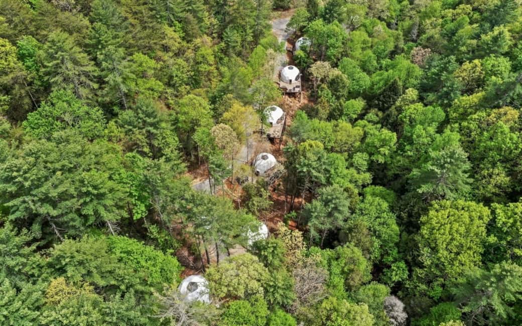 We are 7 domes perched 100 feet away from Fall Branch Falls in Cherry Log, GA (that’s right, domes on a waterfall). Each luxury dome has everything you need to live your best and coziest glamping life. Each dome has AC/heat, king size beds, full kitchen (no oven), custom shower, vintage dressing vanity (because of course), toilet with heated seat and bidet, personal hot tub, fire pit, Blackstone grill, and 20-foot front window and moonroof. All perched on a 40-foot deck.